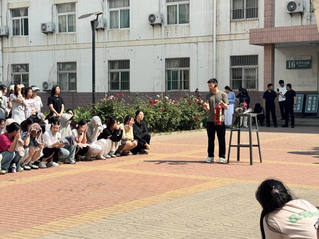 随着警报声响起,同学们迅速反应,在老师和公寓管理员的指引下,用湿毛巾捂住口鼻,弯腰沿墙有序撤离。大家严格按照预定路线疏散,快速抵达公寓广场集合点,整个过程紧张有序,展现了良好的应急能力。与此同时,公司应急小组迅速行动,模拟灭火、维持秩序,为演练增添实战效果。演练结束后,保卫处工作人员为同学们讲授了一堂生动的“安全课”,大家认真聆听消防知识讲解,并积极参与灭火器使用实操练习,掌握了正确的消防技能。