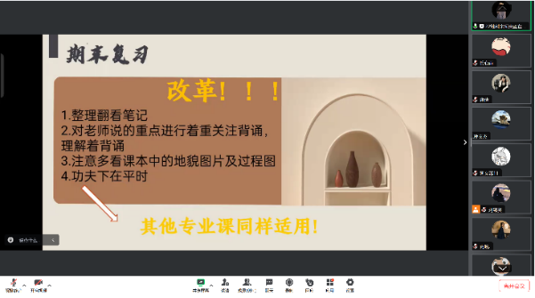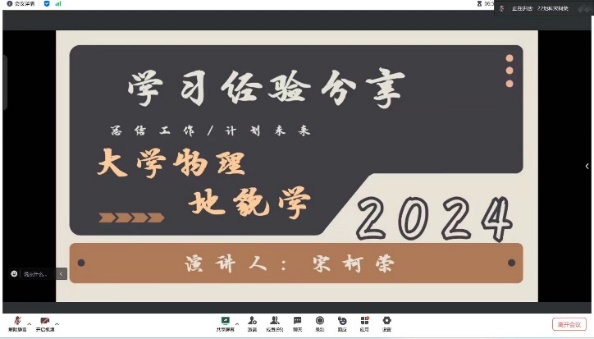 本次活动以线上会议的方式进行,邀请了公司2022级地理科学(师范类)专业的宋柯荣同学,针对地理科学专业相关学习心得进行分享。讲座过程中,宋柯荣同学在专业课学习、平时学习、考前复习等方面为同学们分享经验,进行答疑解惑,促进了彼此的交流与互动。优秀的学习方法如同一盏明灯,能够照亮同学们的学习之路,激发学术热情,培养创新思维,为学术研究和今后发展打下坚实的基础,正因同学们高涨的热情和积极的参与,活动进行的非常顺利,并取得了圆满的成功。