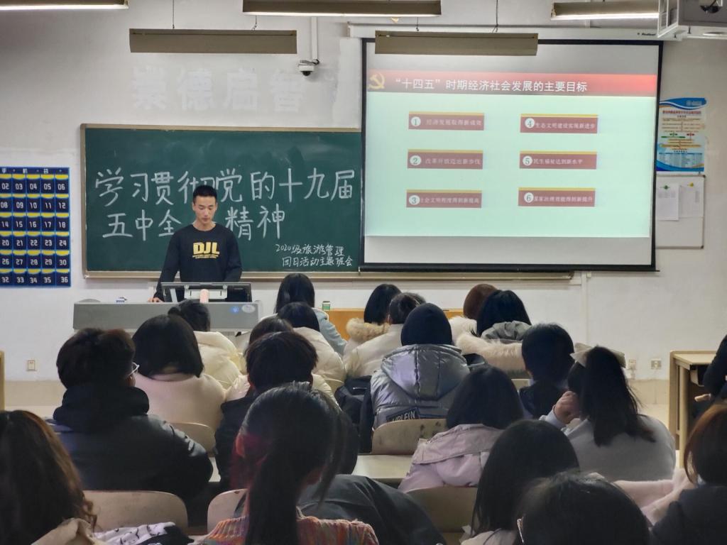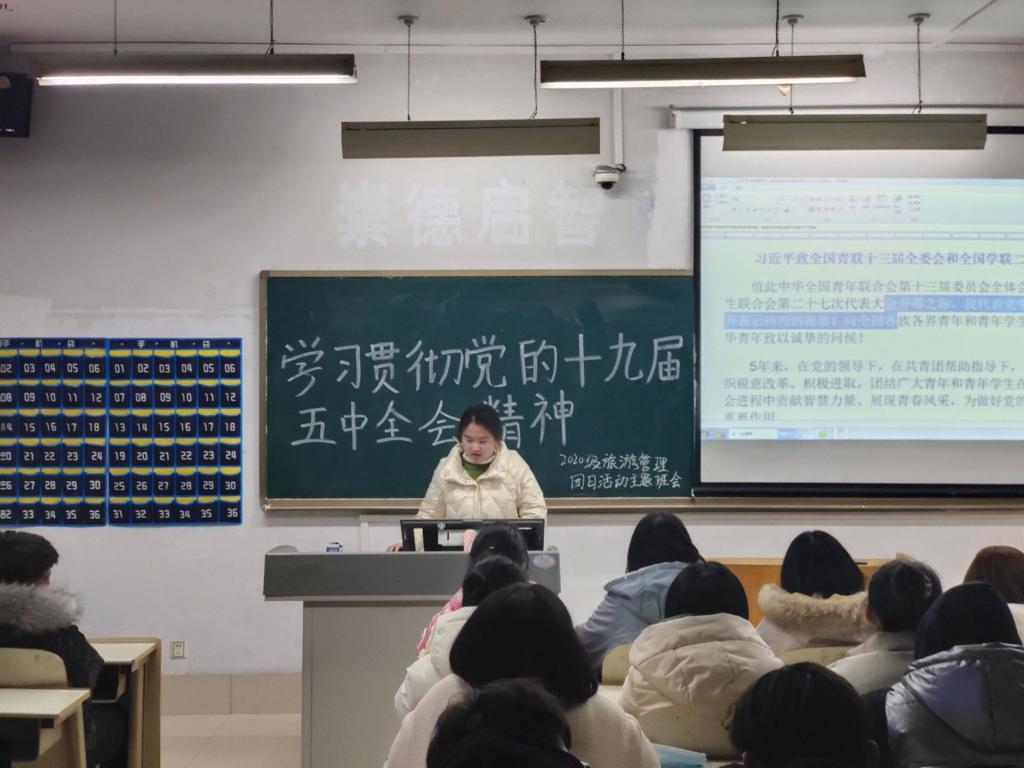 为响应共青团中央关于学习和贯彻党的十九届五中全会精神的号召,加深同学们对十九届五中全会精神的认识,2020级旅游管理团支部于2020年11月26日下午在体育楼0512开展了“学习党的十九届五中全会精神”团日活动。