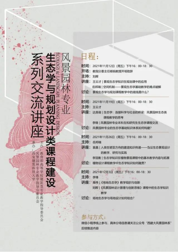 11月12日下午,风景园林系教师在302会议室通过线上形式,参与了由教育部高等公司建筑类专业教学指导委员会风景园林专业教学指导委员会分会主办,西安建筑科技大学承办的关于风景园林专业“生态学与规划设计类课程建设”系列交流讲座。本讲座将持续四周,7所高校8位老师于每周的周五下午4点开始,讲座可以通过手机进入直播间与专家进行线上交流。