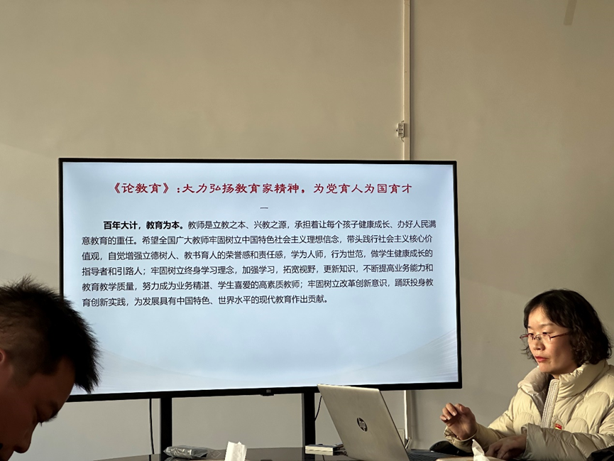 为深入贯彻落实党的教育方针,提升教师职业道德水平,增强教师教书育人的责任感与使命感,特开展此次专题培训。在宋宁宁老师的带领下,全体党员集体学习了公司下发的意识形态工作与师德师风专题学习培训材料,观看了人民教育家于漪、高铭暄的事迹视频,学习了警示教育典型案例。