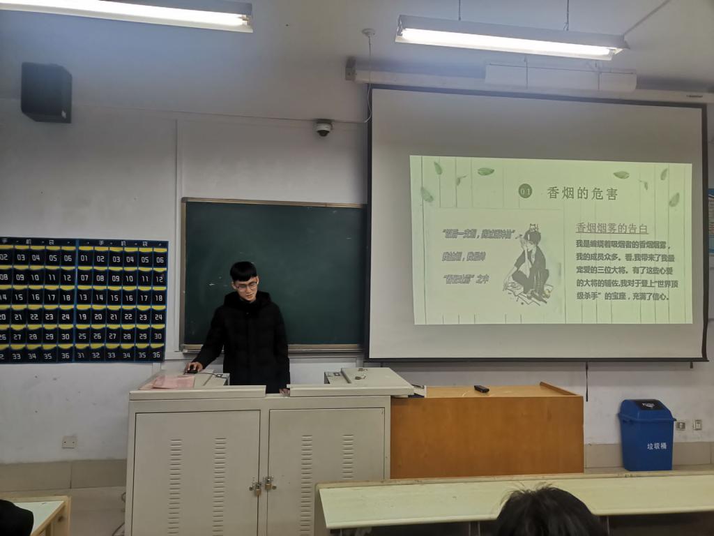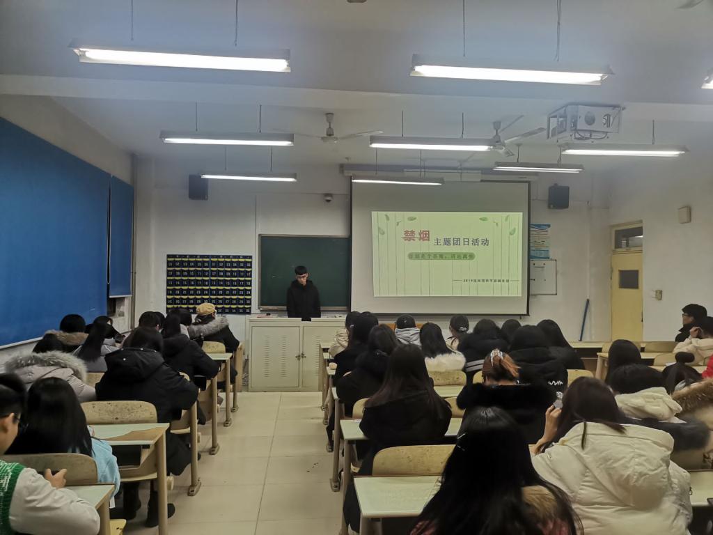 为了净化校园环境,保障师生健康,创建“无烟公司”,公司2019级地理科学班于2020年12月13日,在8号楼0403教室开展了戒烟宣传教育主题团日活动。