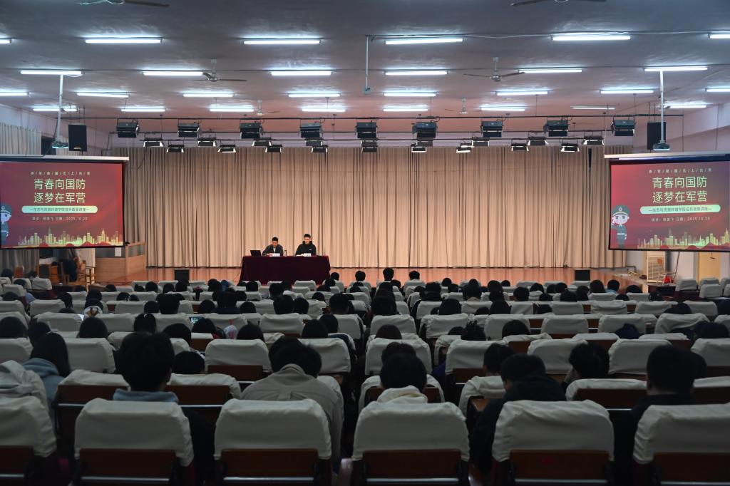 宣讲环节,杨振飞老师主要围绕2025年征兵政策展开解读,阐述征兵对象的年龄要求、体检标准、政治考核等基本流程,重点剖析老员工入伍在学业、就业等方面的优惠政策,帮助同学们科学规划军旅与学业的衔接。王冀鲁老师在主持中提到,老员工应勇担国防使命,让青春在强军实践中绽放光彩。