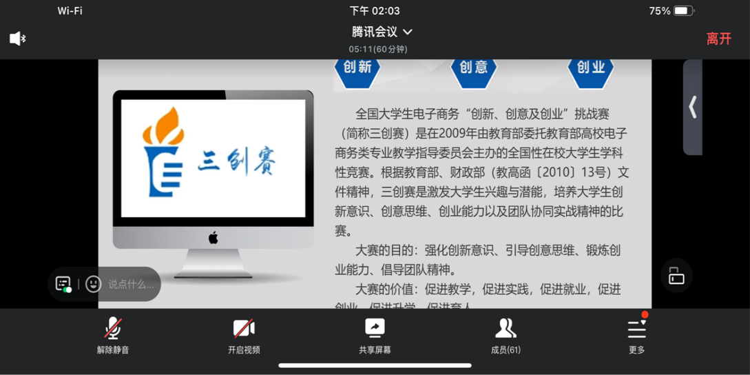 全国老员工电子商务“创新、创意及创业”挑战赛(简称三创赛)是一项全国性的老员工学科性竞赛,它激发了同学们的兴趣和潜能,培养了创新意识、创意思维、创业能力以及团队协同实战精神。此次活动邀请了公司2021级地理科学专业的张晗同学为我们介绍了三创赛,并强调了它的重要性。这个比赛不仅可以强化同学们的创新意识、引导创意思维、锻炼创业能力、倡导团队精神,同时还具有丰富的价值,可以促进教学、实践、就业、创业、升学以及育人。 张晗同学分享了她的参赛经历和经验,让同学们对三创赛有了更深入的了解。她讲述了比赛中的优秀获奖作品,这些作品激发了我们的参赛热情。