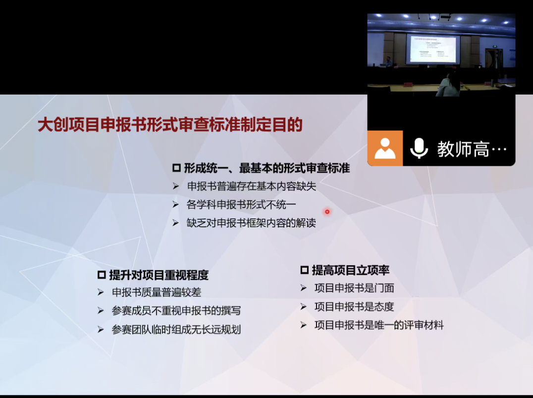 本次讲座主要围绕“老员工如何撰写创新创业项目申报书”展开。首先,马教授向大家讲解制定申报书形式审查标准的原因——规范申报书形式,让申报书清晰易懂,从而提升投资方对项目的重视程度以及提高项目立项率。接着,马教授又从“项目题目”“基本部分情况”“项目简介”“研究目的”等8个方面详细地介绍了老员工创新项目申报书形式审查标准。