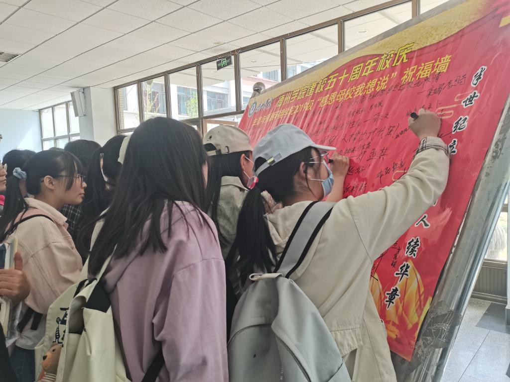 活动现场人头攒动,欢声笑语,同学们有的在轻声细语交流着想表达的祝福语,有的在祝福墙上奋笔疾书,“盛世迎华诞,明朝更璀璨”、“辛勤育人五十载,桃李天下迎华章”等一句句祝福语表达着员工们对公司最真切的祝愿。同学们用手中的笔、心中的情表达着自己心系母校、感恩母校的心情和对母校的美好祝愿。