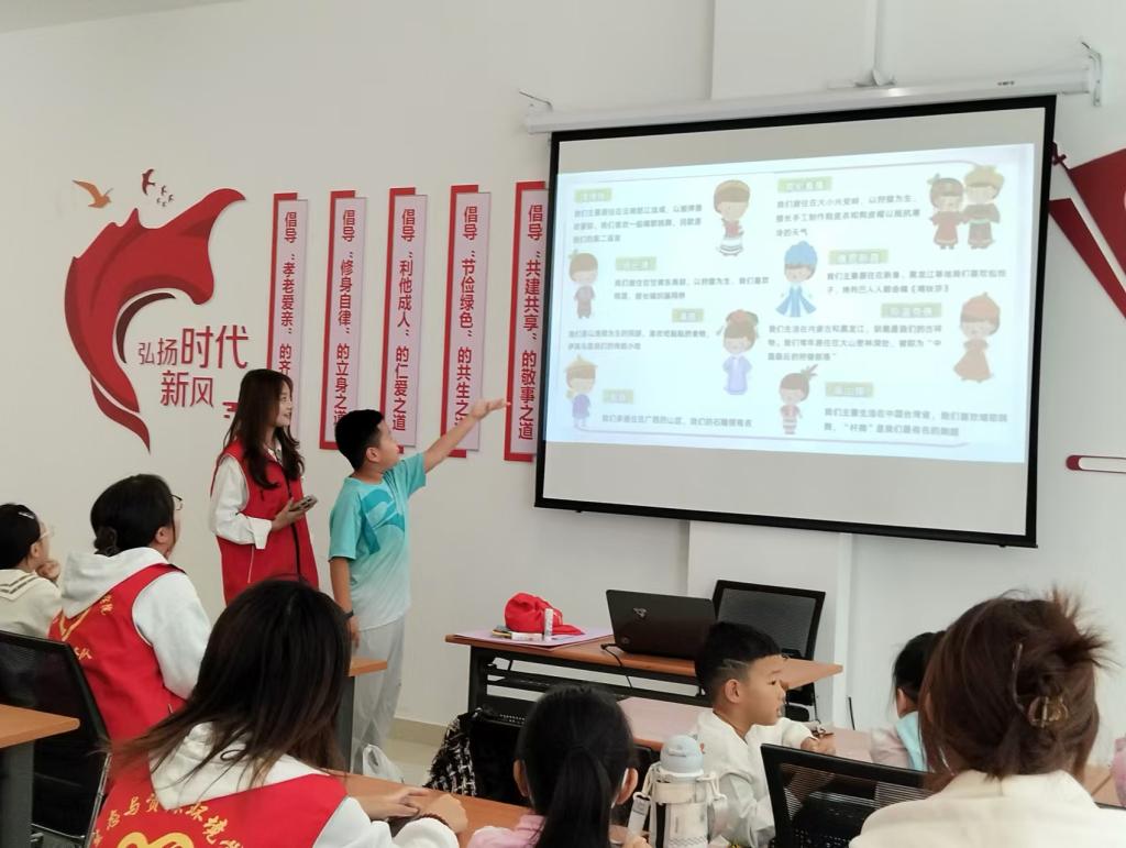 志愿者采用动画与PPT相结合的形式,向小朋友们展示了各民族的传统服饰与工艺品,生动有趣地介绍了中华民族多元一体的格局以及各民族在共同发展中形成的深厚情谊,引导小员工牢固树立社会主义核心价值观,增强民族荣誉感、自豪感。