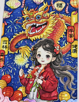 本次“乘风似龙翔,万里盛华章”2024龙年春节系列活动包括五个部分,分别为“龙行龘龘,前程朤朤”新年祈福活动,一“表”人才,出水福“龙”—表情包贺新年活动,活力满满,欣欣向 “龙”—晒晒我的多彩寒假活动,“执手中笔,绘心中国”新年绘画活动和“春联贺新年,创意展风华”—春联创作大赛。在新春祈福活动中同学们分享手工DIY明信片传达对新年的美好期待和虔诚祝愿;表情包贺新年活动中,各种表情包应有尽有,幽默搞怪的,清新自然的,更增加了新年的欢乐氛围;在晒晒我的多彩寒假活动中,同学们用Vlog的形式积极分享自己的日常生活,增强对生活的热爱与感悟;在新年绘画活动中,同学们拿起画笔,让自己的想象力自由飞翔,用画笔勾勒出一幅幅构思新奇、韵味独到的图画;在春联创作大赛中,同学们用飘逸的字体和独特的创意所创作出来的春联各有特色,为新春佳节增添了一份别样的文化气息。同学们积极参加本次活动,整个活动过程十分顺利并于1月31日圆满成功。