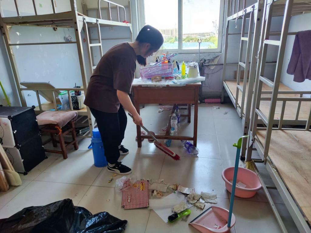本次活动中,志愿者们发扬不怕脏、不怕累的勤恳实干的工作精神,合理分工,相互配合,积极完成各自的任务,为已离校的毕业生们打扫地面、擦拭窗台、整理垃圾、开窗通风、竭尽全力的把宿舍的每一处角落、缝隙打扫干净并进行消毒杀菌工作。经过志愿者们辛勤认真地打扫,寝室环境焕然一新。
