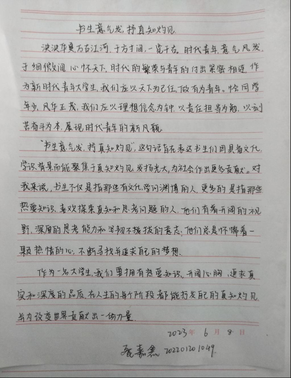 为促进形成良好的院风、班风、学风,进一步强化员工的自我管理、自我服务、自我教育意识,营造奋发向上的学习氛围和良好的育人环境,培养良好的学习习惯,公司积极响应公司号召,于2023年6月1日至6月10日面向全院同学开展了“书生意气发,抒真知灼见”学风建设主题征文活动。