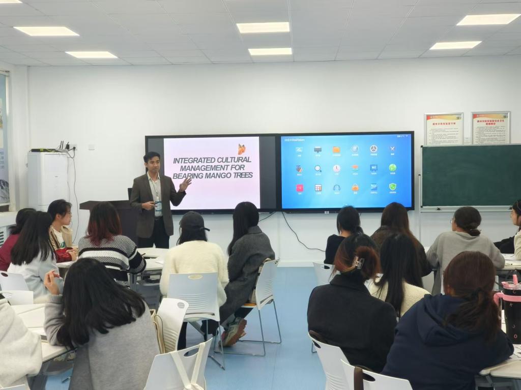 下午,费利佩博士给风景园林专业的员工上了一节生动的面授课。费利佩博士以其丰富的专业知识和新颖的教学形式,为员工们深入讲解了芒果树的生长环境、种植模式以及提高芒果产量的有效方法,通过实际案例和互动讨论,大大激发了员工们的学习兴趣和参与热情。